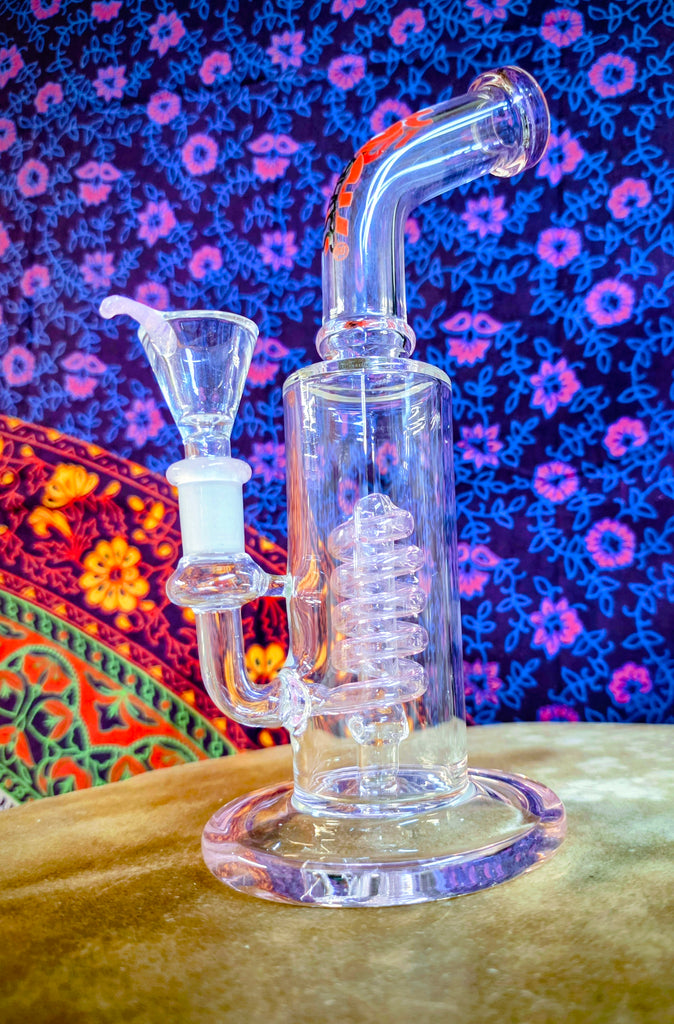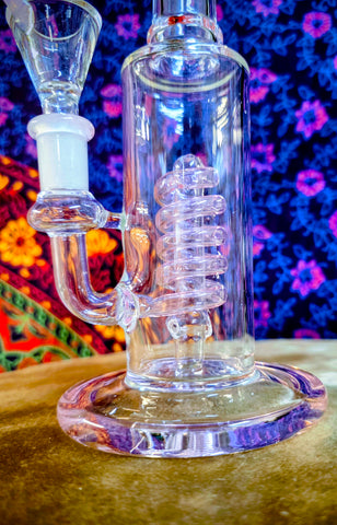 10” Rock Glass Single Spiral Perc Bent Neck Waterpipe w/ Pink Accents-RS563