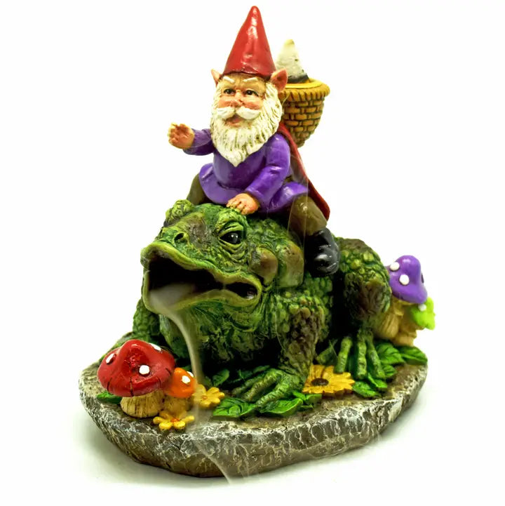 Gnome Riding Frog Back Flow incense Burner 5 1/2 inches tall