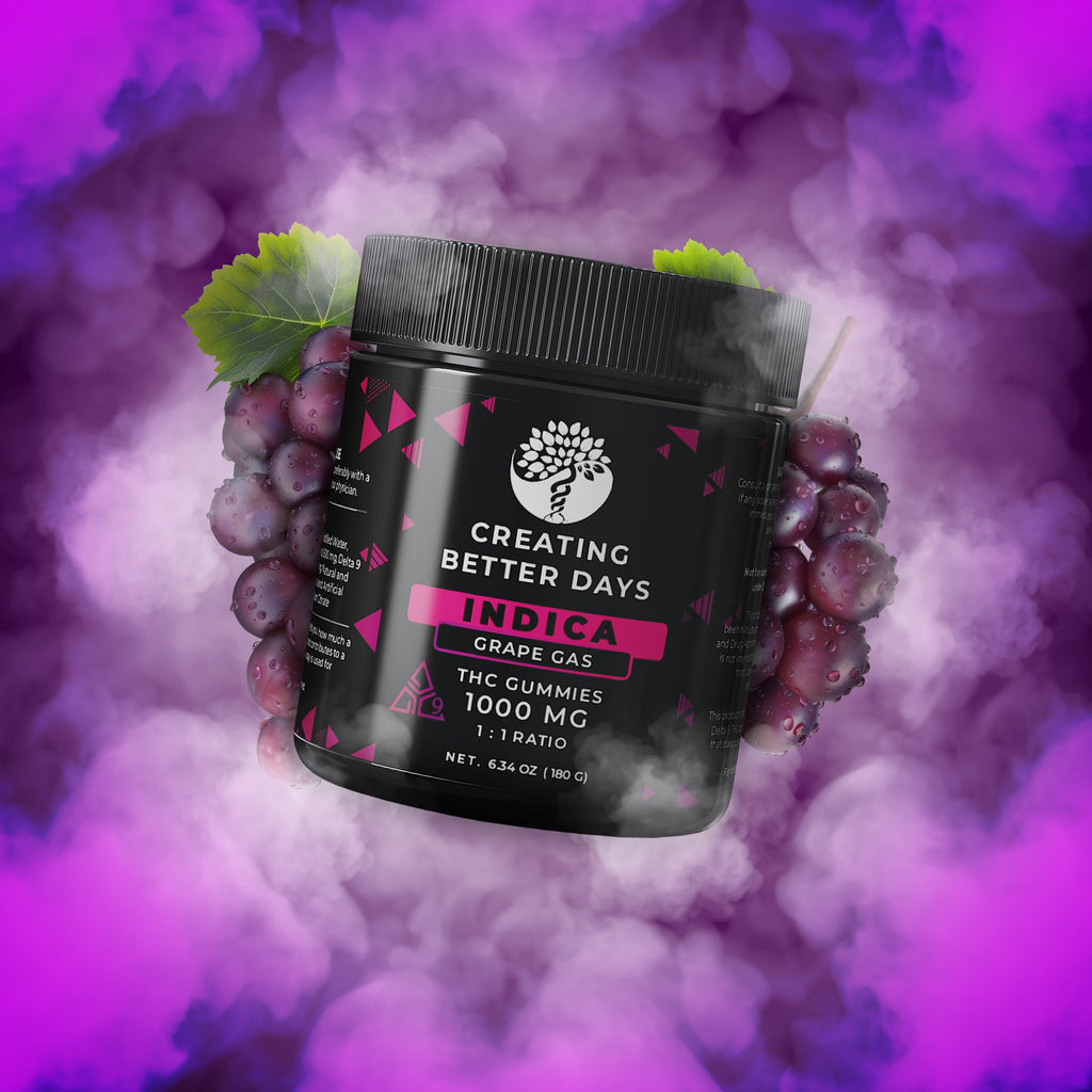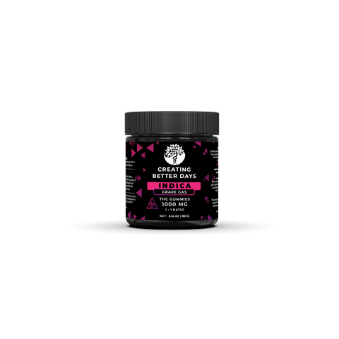 Creating Better Days' Grape Gas (Indica) THC + CBD Gummies – 1000mg Total Cannabinoids.